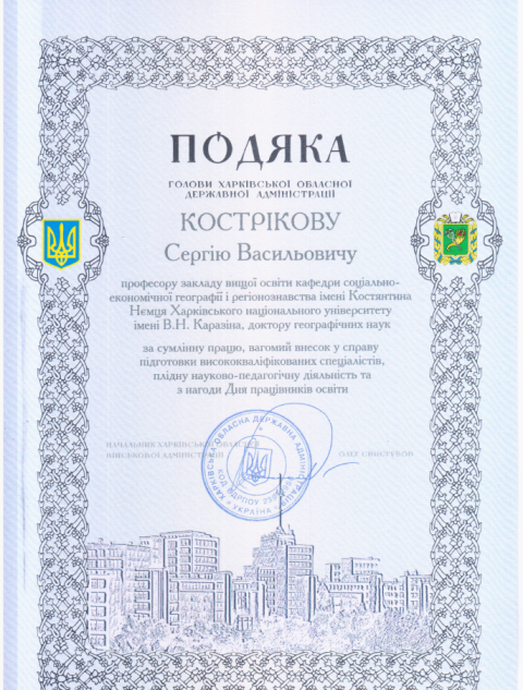 27 жовтня 2025 року, під час засідання Вченої ради Університету з нагоди Дня працівників освіти, було нагороджено доктора географічних наук, професора кафедри соціально-економічної географії і регіонознавства імені Костянтина Нємця – Сергія Васильовича КОСТРІКОВА.