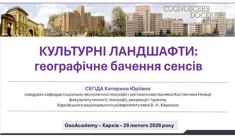 28 лютого 2026 року у рамках проєкту «GeoAcademy» завідувач кафедри Катерина СЕГІДА прочитала для абітурієнтів лекцію «Культурні ландшафти: географічне бачення сенсів», ознайомила учнів із концепціями, спрямованими на пояснення формування та функціонування культурних ландшафтів, розглянули приклади по країнах світу, обговорили питання емоційної географії, партисипації та меморіалізації просторів в Україні в умовах сьогодення.