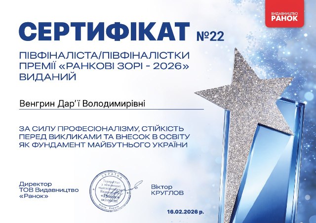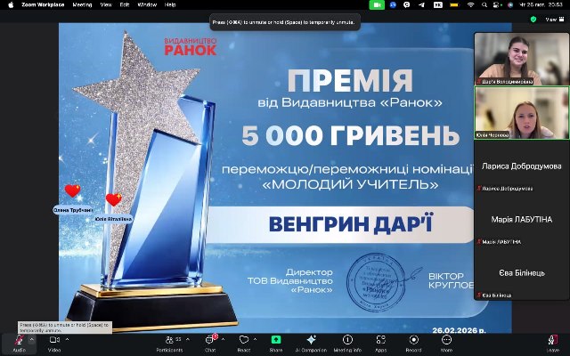 • Вітаємо Венгрин Дарʼю з перемогою в номінації “Молодий учитель” у щорічній премії “Ранкові зорі -2026” від видавництва Ранок